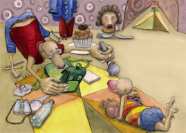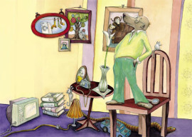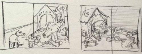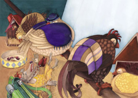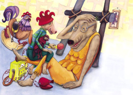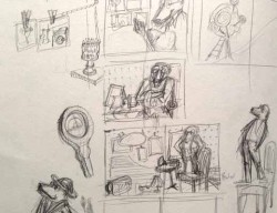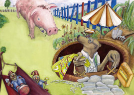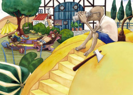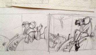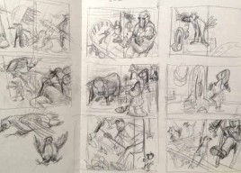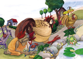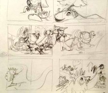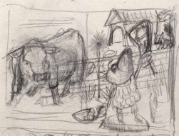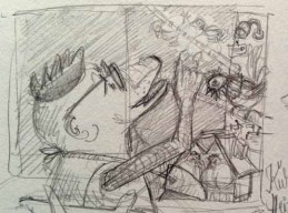 Die Geschichte nahm Gestalt an, die Textblöcke wurden in Szenen unterteilt und die Hauptfiguren langsam modelliert. Es entstanden viele kleine Skizzen, die schließlich auf großen DIN A2 Bögen zu fertigen Zeichnungen wurden. Als die Bleistiftzeichnungen abgeschlossen waren, begann die eigentliche Illustration mit Aquarellfarben und Buntstiften. Ich ließ bewusst Platz für den Text, ohne zu wissen, dass dieser später nicht ausreichen würde. Denn was dann kam, übertraf alles, was ich mir erhofft hatte.